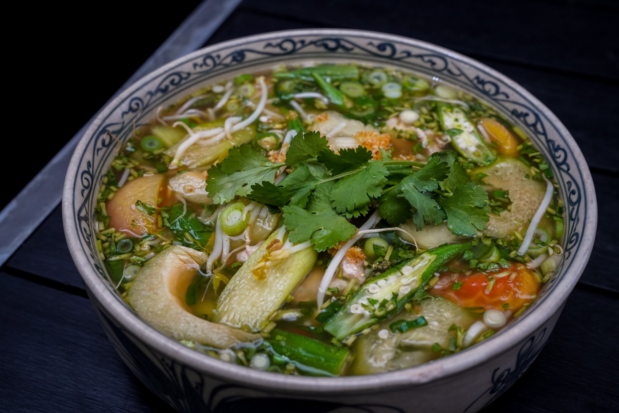 CANH CHUA TÔM - (VIETNAMESE SOUR SOUP WITH PRAWNS)$27.00A traditional chicken broth with tamarind flavours & various vegetables like okra, tomatoes, pineapple, beansprout & elephant ear stem