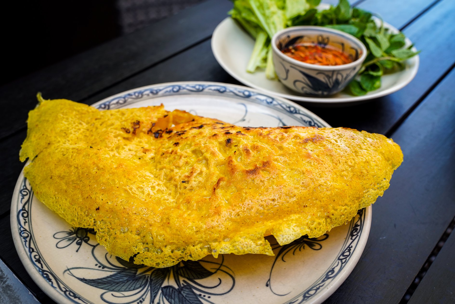Bánh Xèo - (Vietnamese Pancake) (GF)$18.00Crispy eggless dome shaped pancake filled with prawns and pork, onions and beansprouts. With fresh Vietnamese lettuce and herbs with fish sauce