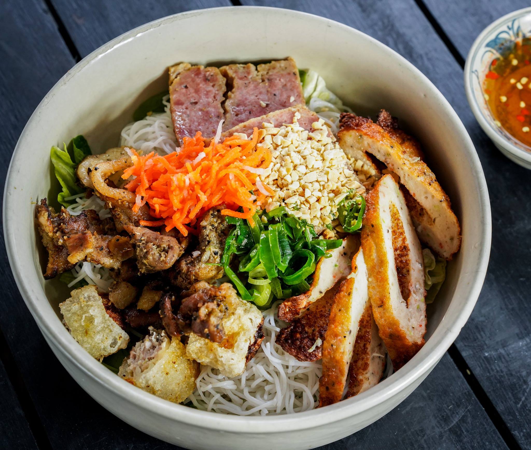BÚN ĐẶC BIỆT - (Combination Vermicelli Salad) (NUTS) (GF)$17.00(grilled pork, sugar cane prawn, bbq pork, spring rolls)