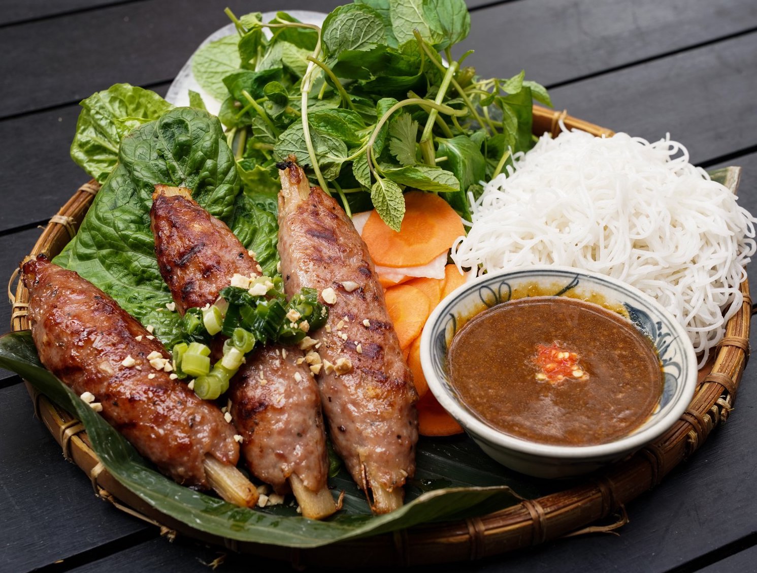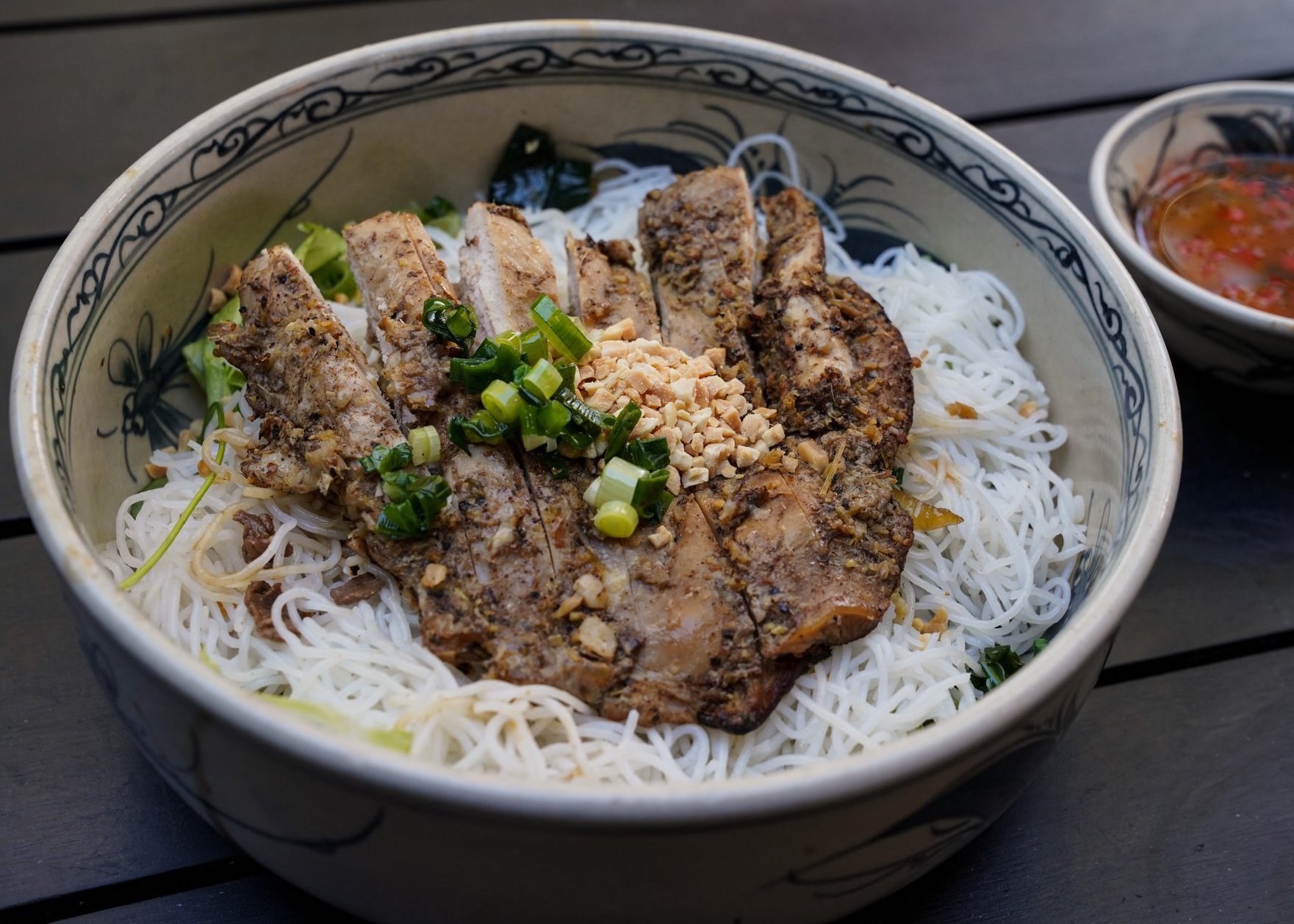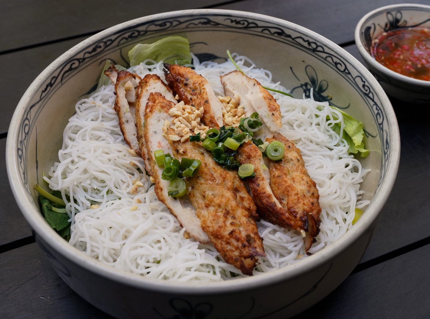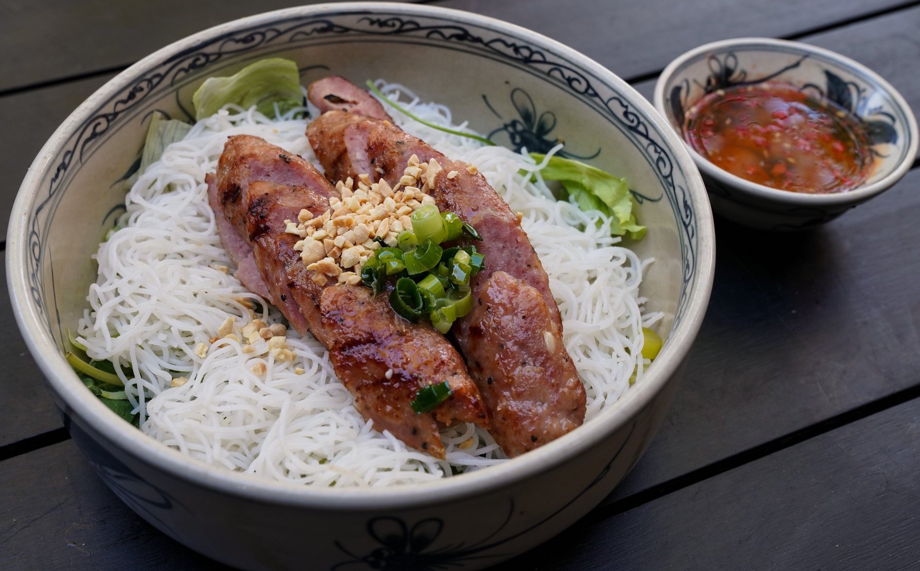 GLUTEN FREE OPTIONS AVAILABLE ON REQUEST- BÚN NEM NƯỚNG - (Grilled Pork Skewers Vermicelli Salad) (NUTS) (GF)$14.00